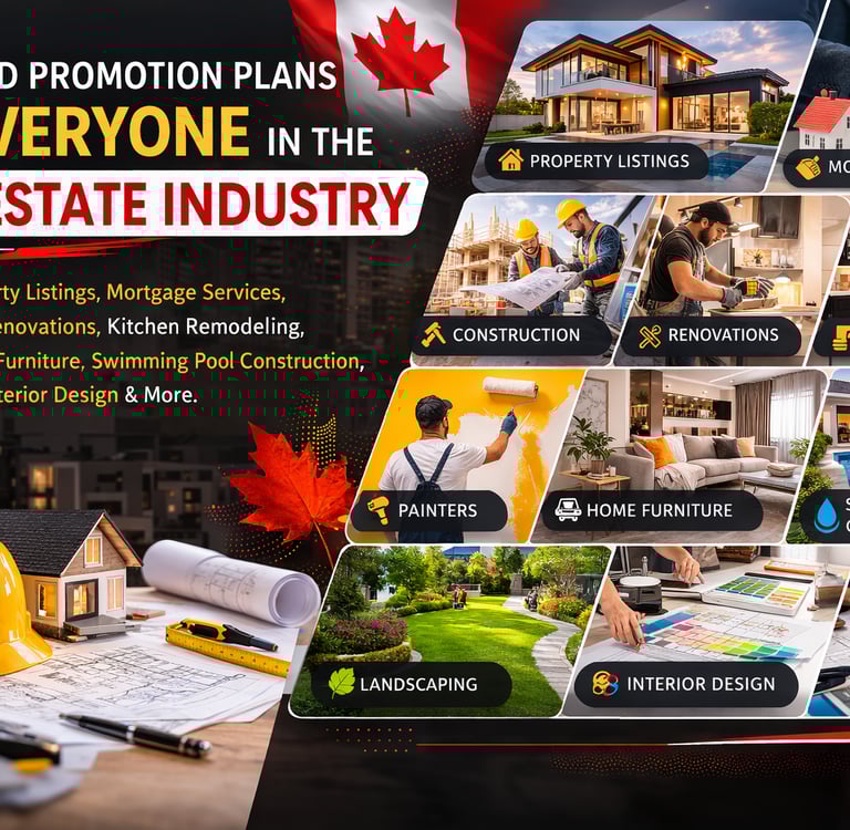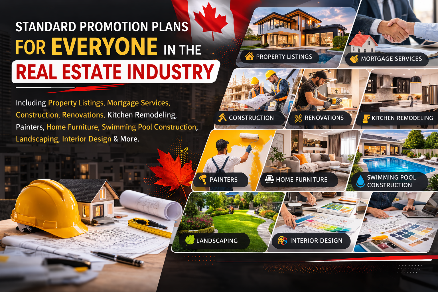 These are standard promotion plans for everyone in the real estate industry — including property listings, mortgage services, construction companies, renovation services, kitchen remodeling, painters, home furniture brands, swimming pool builders, landscaping, interior design, and other real estate–related businesses across Canada.