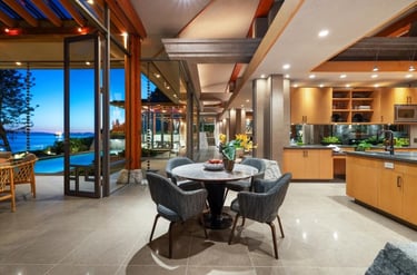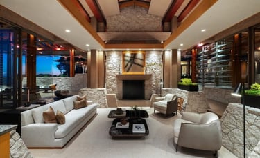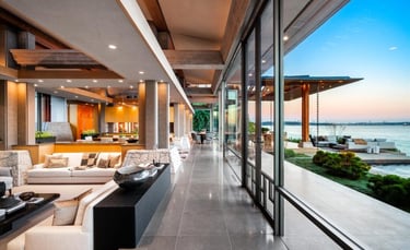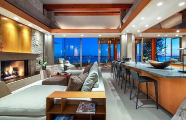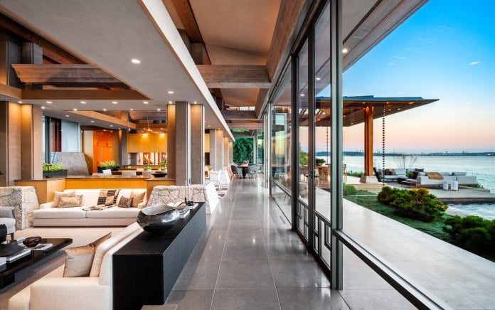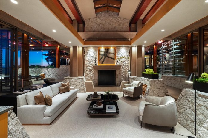 Designed by renowned architect Russell Hollingsworth, the residence reflects the essence of West Coast modern architecture, where indoor living spaces seamlessly connect with the surrounding landscape. With nearly 10,000 square feet of living space, spectacular ocean views, and more than 200 feet of private shoreline, this estate represents the pinnacle of waterfront luxury.