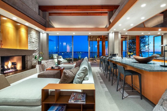 This particular property sits on a rocky oceanfront bluff overlooking the Pacific Ocean, offering unobstructed panoramic views that stretch across the water toward Stanley Park and Point Grey. The home’s elevated setting not only maximizes the scenery but also ensures privacy and tranquility.